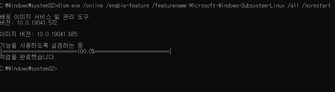 $ dism.exe /online /enable-feature /featurename:Microsoft-Windows-Subsystem-Linux /all /norestart