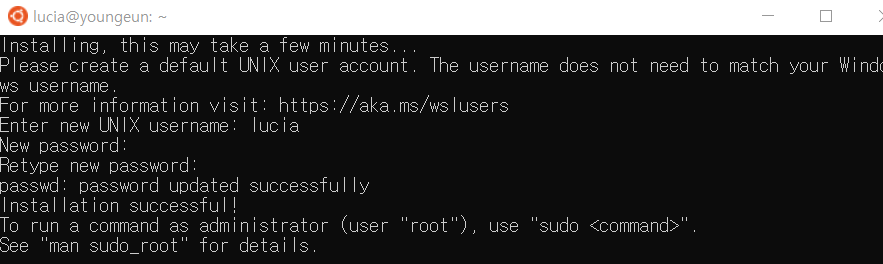 wsl 1은 이 단계에서 끝! (wsl 2로 업데이트를 하는 경우 공식문서 참고하기!)