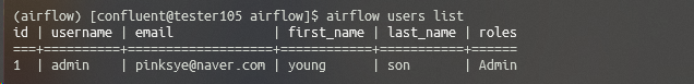 (airflow) [confluent@tester105 airflow]$ airflow users create --username admin --firstname young --lastname son --role A