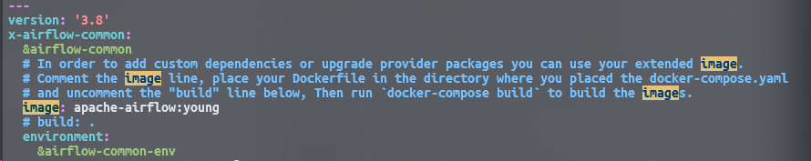 6. docker-compose.yaml 파일을 vi 편집기로 열어, airflow 도커 이미지 이름을 방금 생성한 이름으로 수정합니다.
