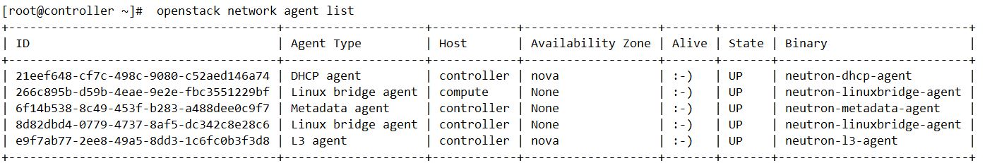 이때 컨트롤러 노드에는 4개의 에이전트, 컴퓨트 노드에는 하나의 에이전트가 출력되어야 한다.
