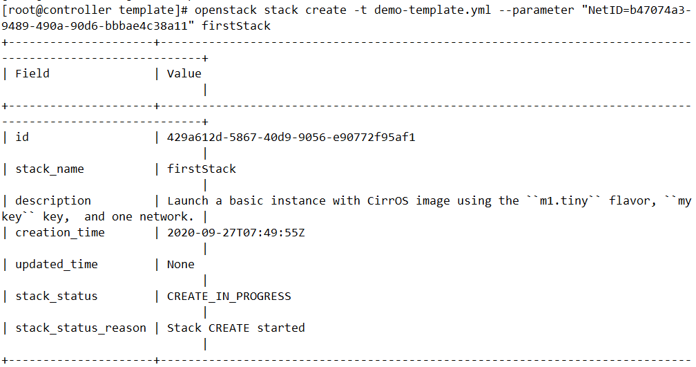 # openstack stack create -t demo-template.yml --parameter "NetID=b47074a3-9489-490a-90d6-bbbae4c38a11" firstStack