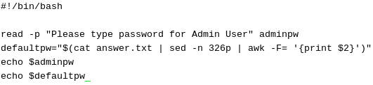 defaultpw = "$(cat answer.txt | sed - n 326p | awk -F= '{print $2}')"