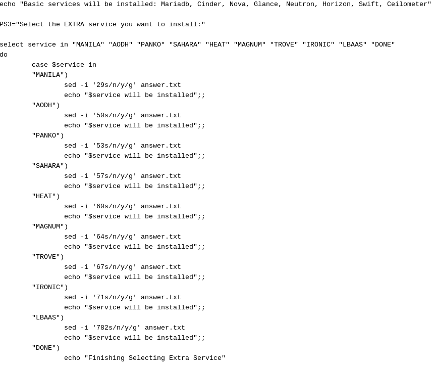 echo "Basic services will be installed: Mariadb, Cinder, Nova, Glance, Neutron, Horizon, Swift, Ceilometer."